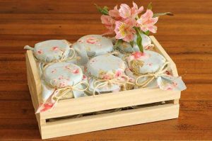 O mimo, geralmente, é colocado em uma caixa transparente ou em cima de um prato de cerâmica. Fitas e papéis seguem a cor principal do evento.